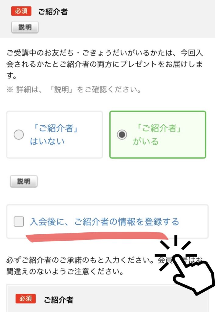 1.入会の紹介者入力画面で「入会後にご紹介者の情報を登録する」にチェック