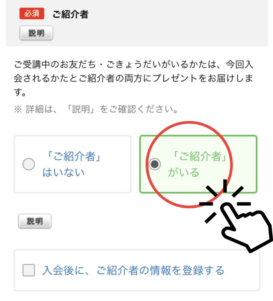 ①入会時に「入会後にご紹介者の情報を登録する」にチェックを入れる。