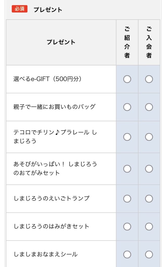 紹介制度を利用してこどもちゃれんじに入会すると、かわいいしまじろうのプレゼントや、e-giftを選んでもらえるのがうれしいですね。