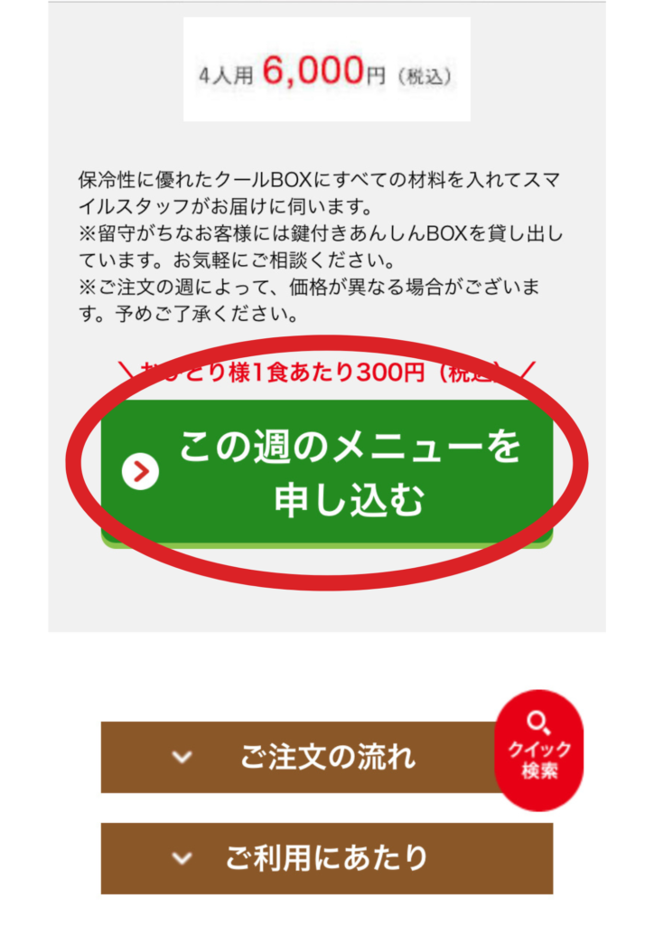 1. 次の画面を下にスクロールして「この週のメニューを申し込む」を押す。