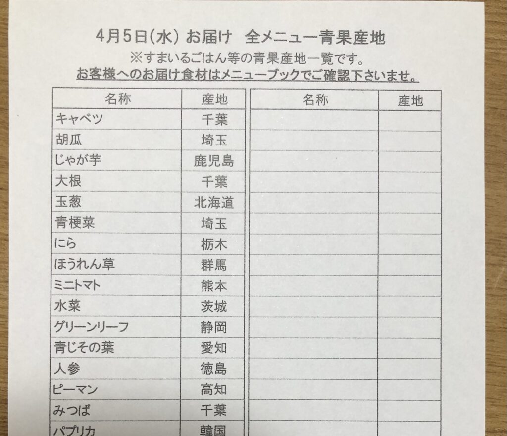 毎回どこで作られた食材なのかがわかる産地表示表が届くので、安心感があります。