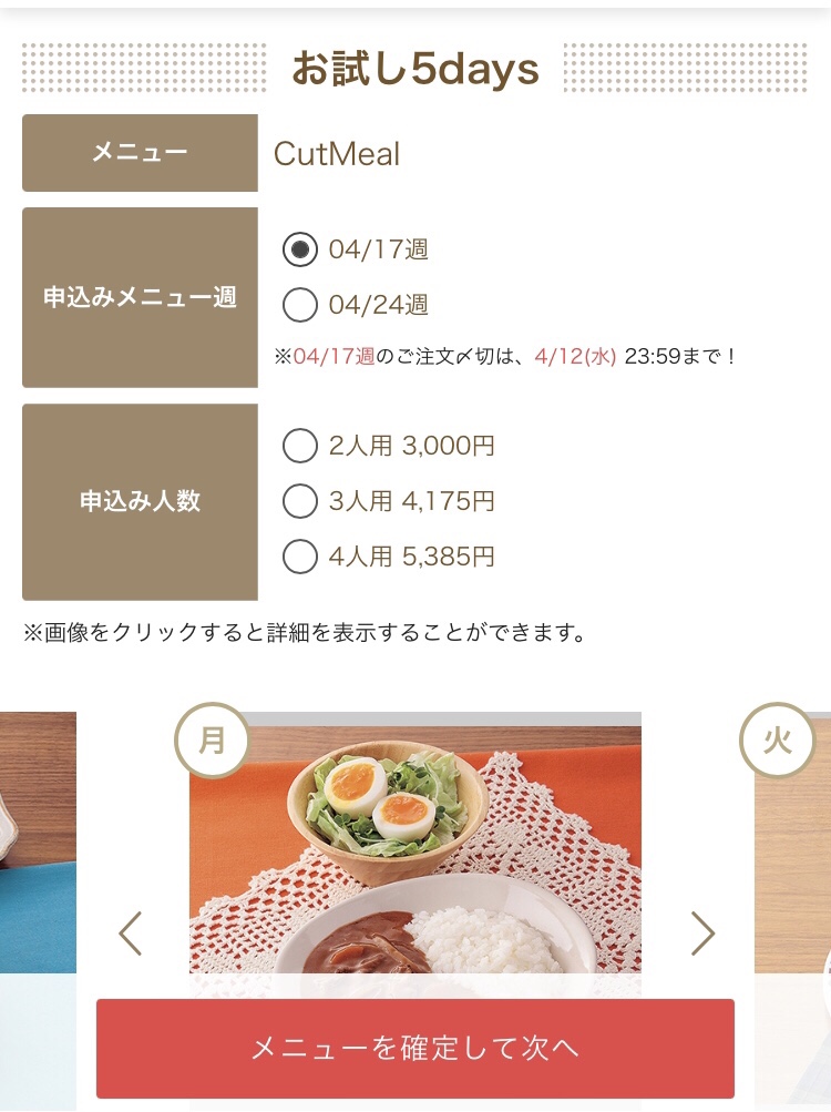 1. 「申し込みメニュー週」と「申し込み人数」を選択。「メニューを確定して次へ」を押す。